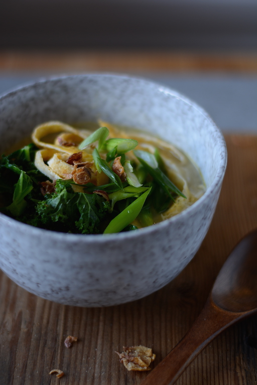 To serve, ladle bowls of soup first, then garnish with the Kale leaves on one side and strips of egg ribbon on another. Top with the fresh spring onions and fried shallots.